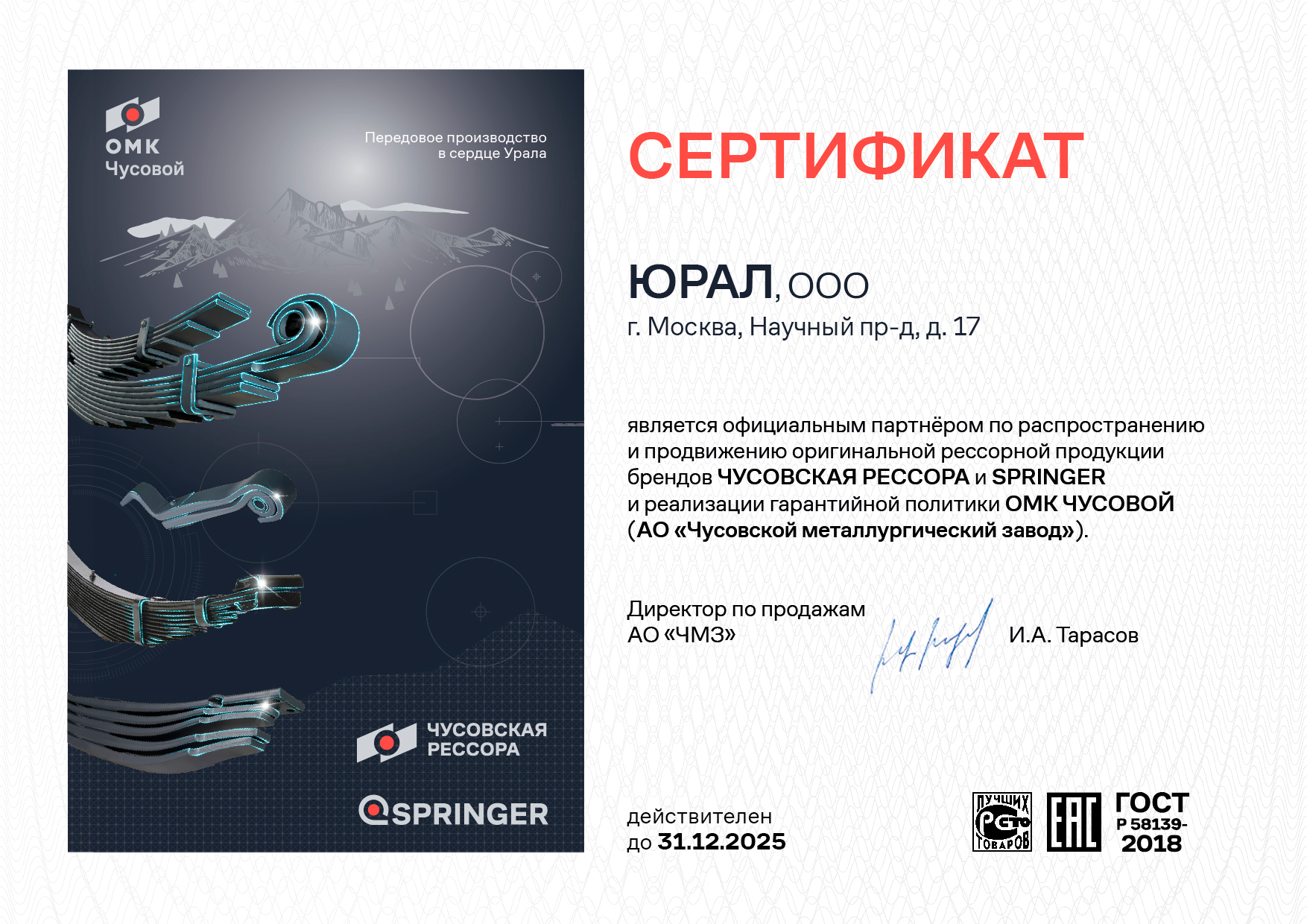 Рессоры, произведенные АО «ЧМЗ» хорошо знакомы как потребителям, так и профессионалам рынка своим качеством и надёжностью. С 2009 года завод поставляет малолистовые рессоры для грузовиков спортивной команды «КАМАЗ-мастер», семнадцатикратных победителей ралли «Дакар». Пройдя самый строгий контроль качества, продукция Чусовского завода получила допуск на сборочные конвейеры VOLVO в Калуге и Ford Sollers в Елабуге, КАМАЗ, УАЗ, ГАЗ, НеФАЗ.